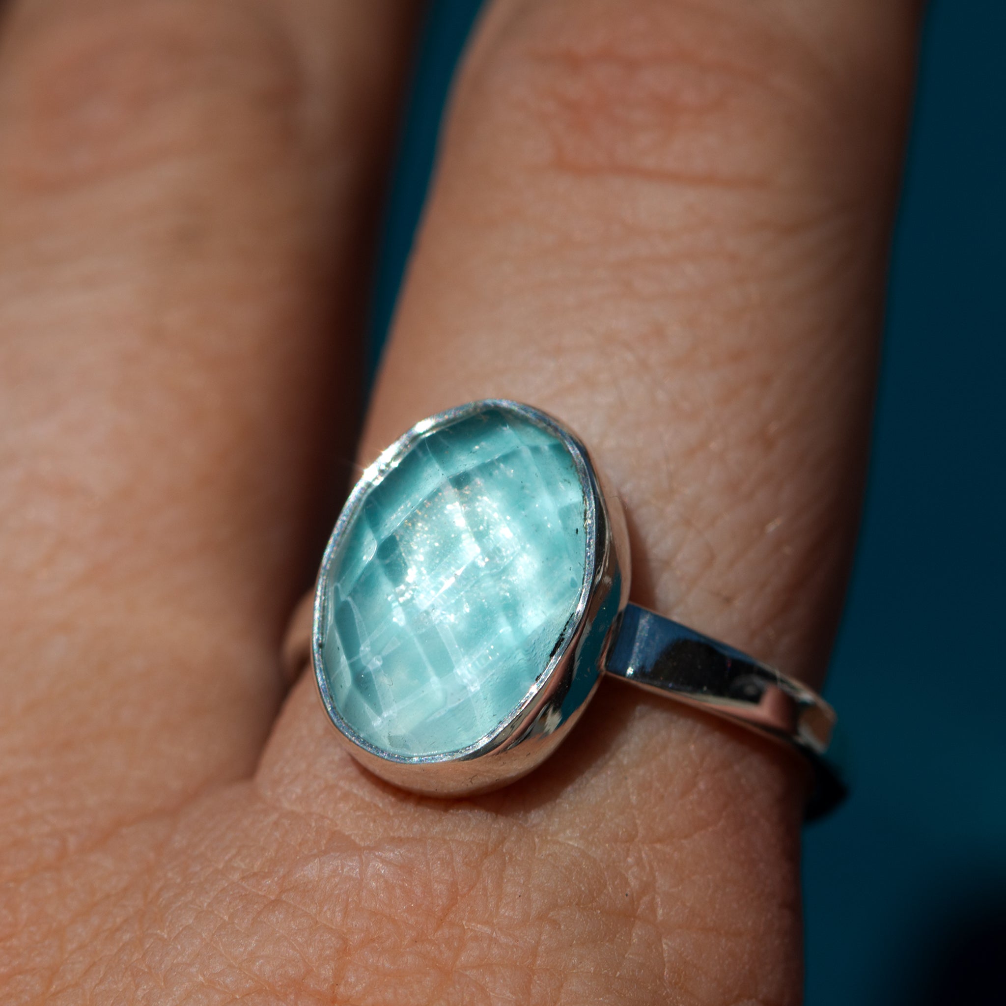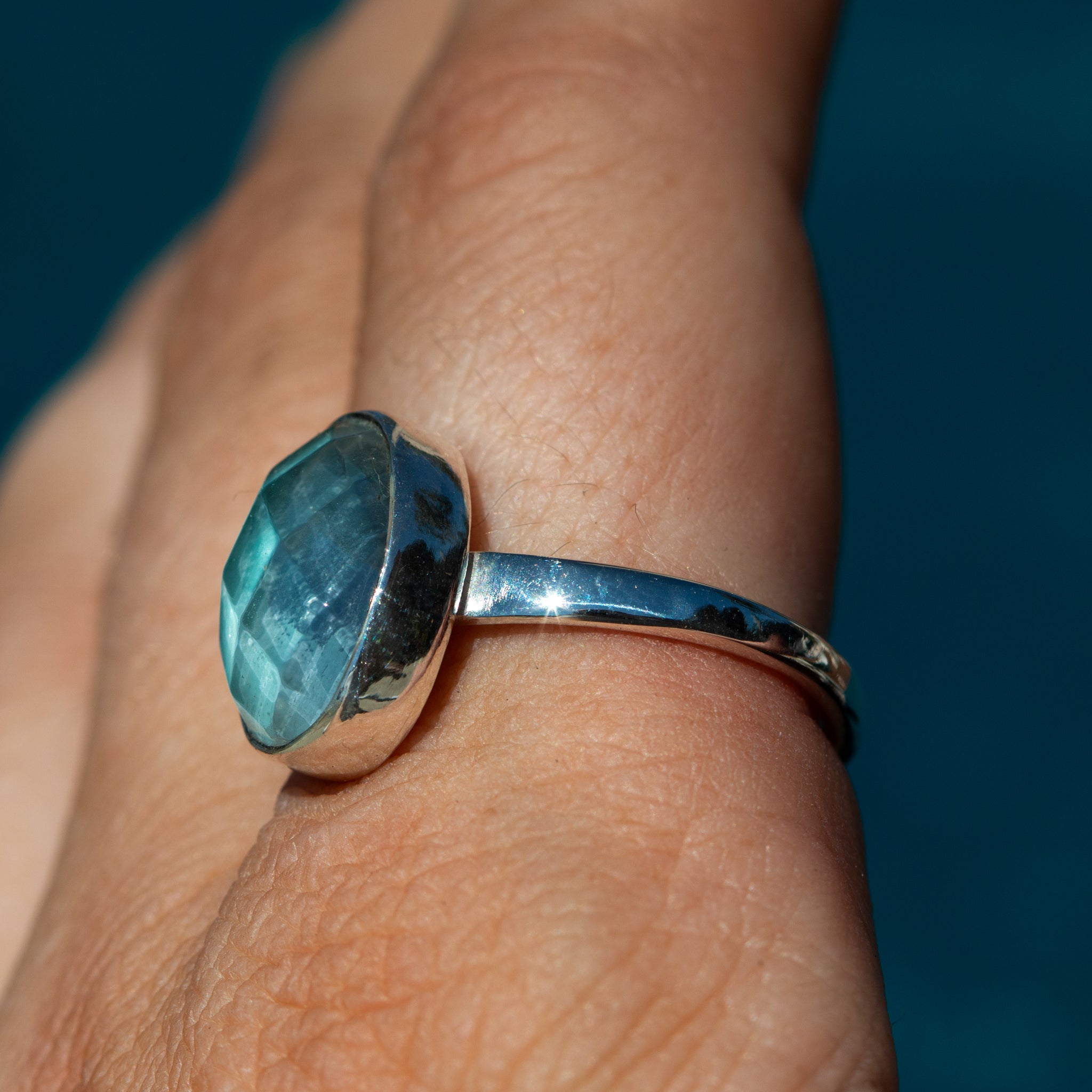 This rose cut clear quartz with turquoise inlay behind the gem, creates a soft glow that reflects like sunlight dancing on water. Each stone holds its own natural beauty, making every ring one of a kind.