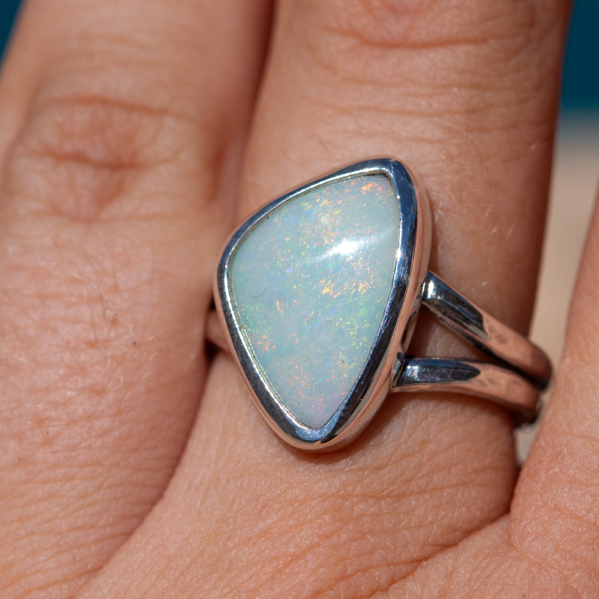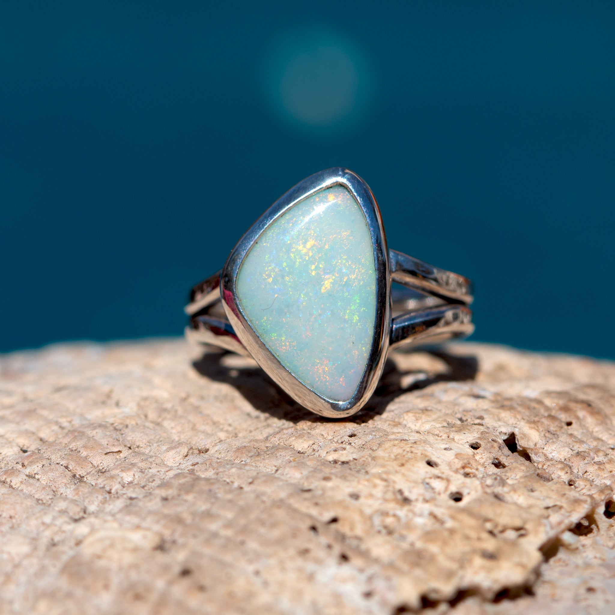 This Australian opal ring is set on a hammered double band, allowing the natural fire within the stone to shine in every movement. No two opals are ever the same, making this ring truly unique and unrepeatable.