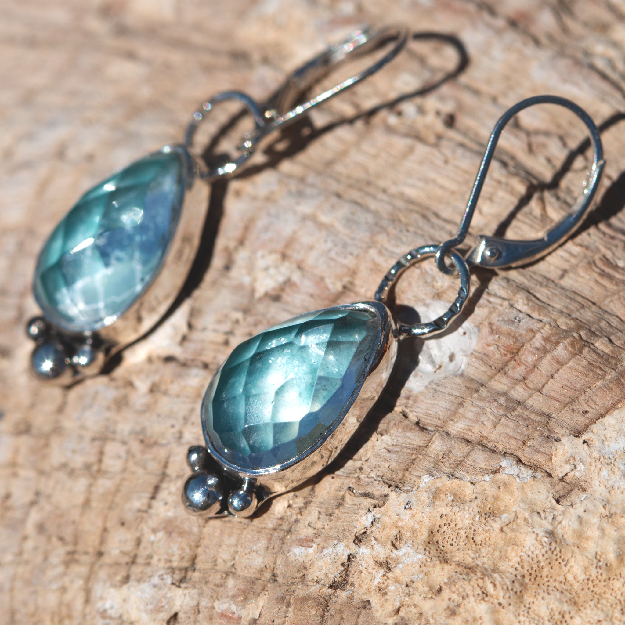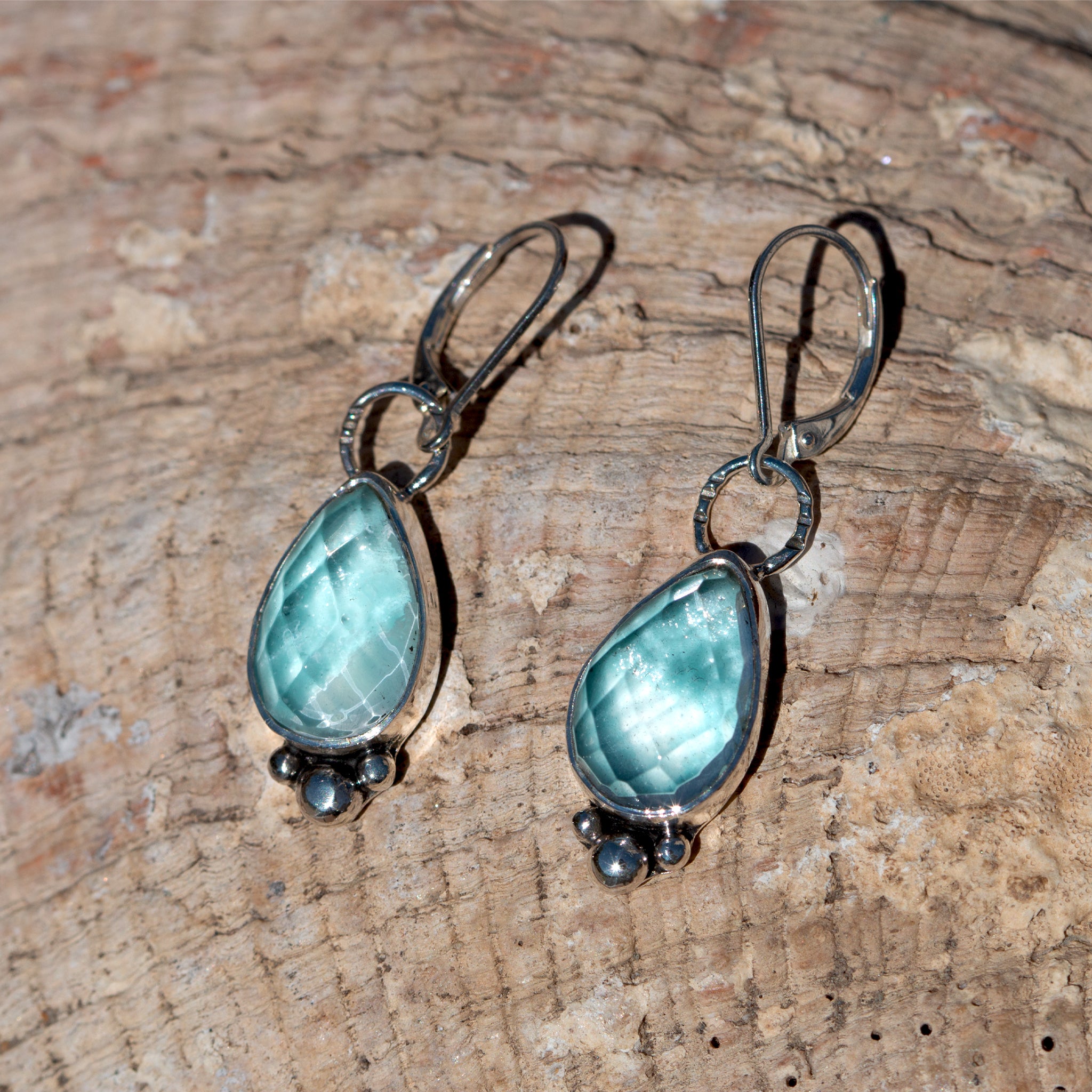 Rose cut quartz with turquoise inlay behind the stone. These lightweight earrings feature a secure leverback design, made to stay comfortably in place throughout your day without slipping or falling out. Effortless, minimal, and made to move with you.