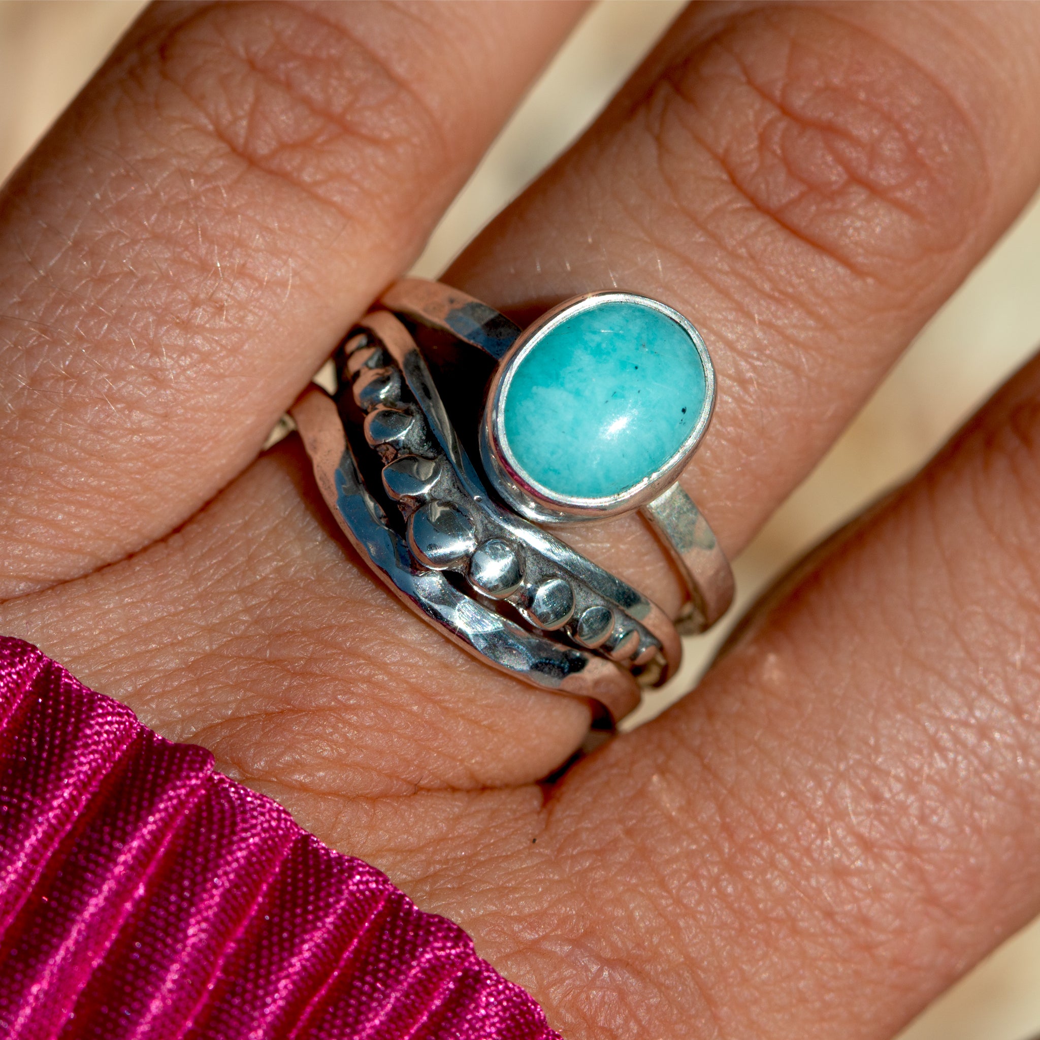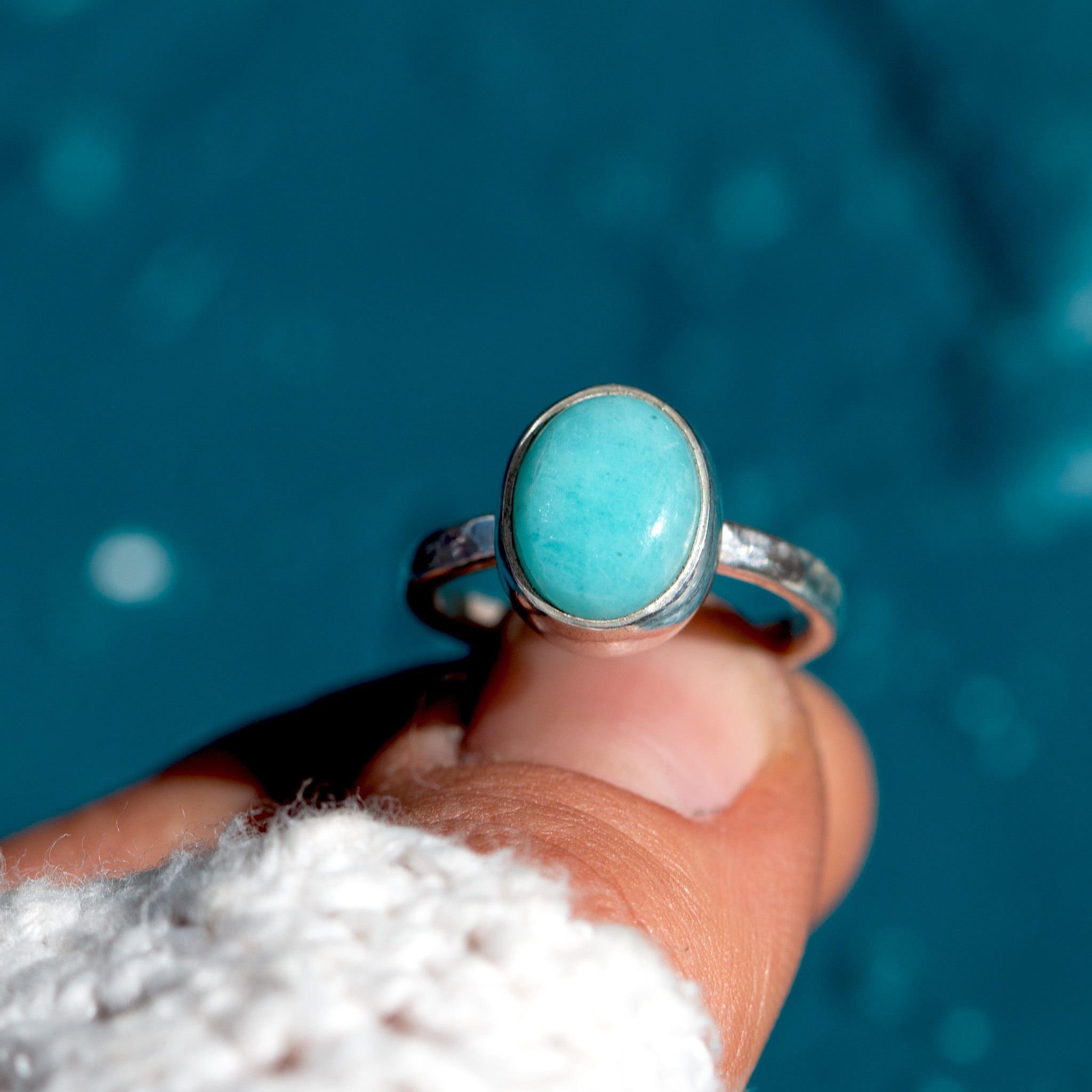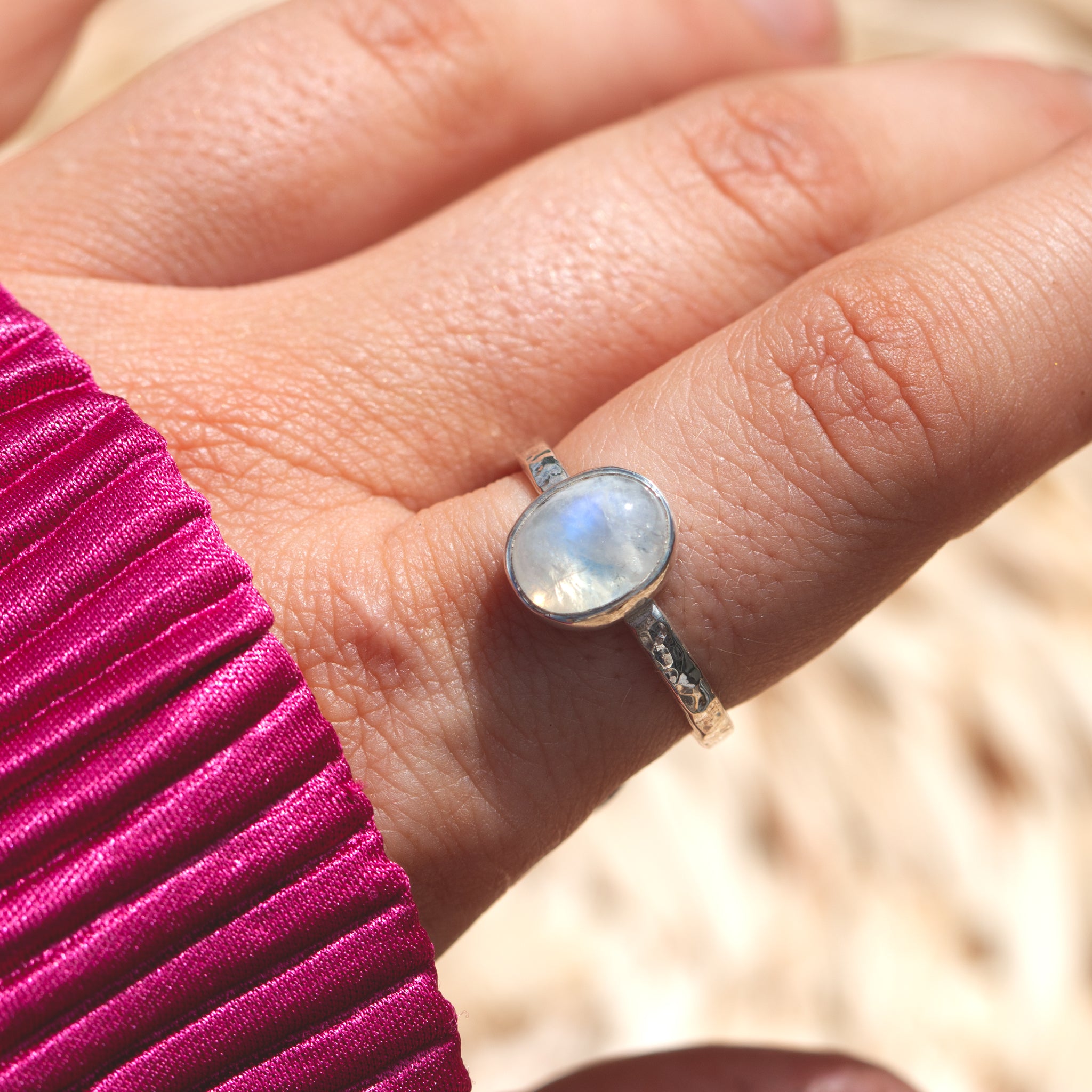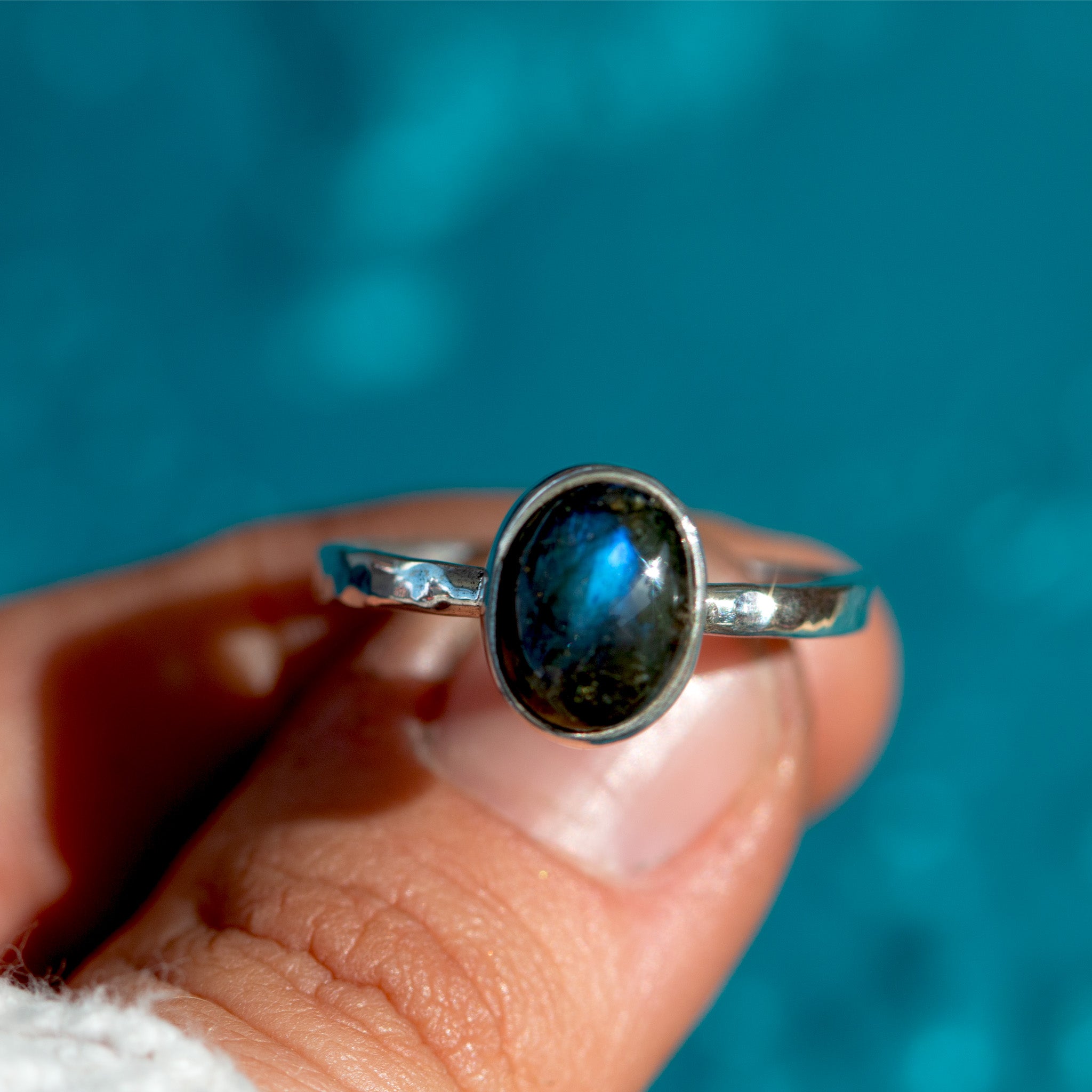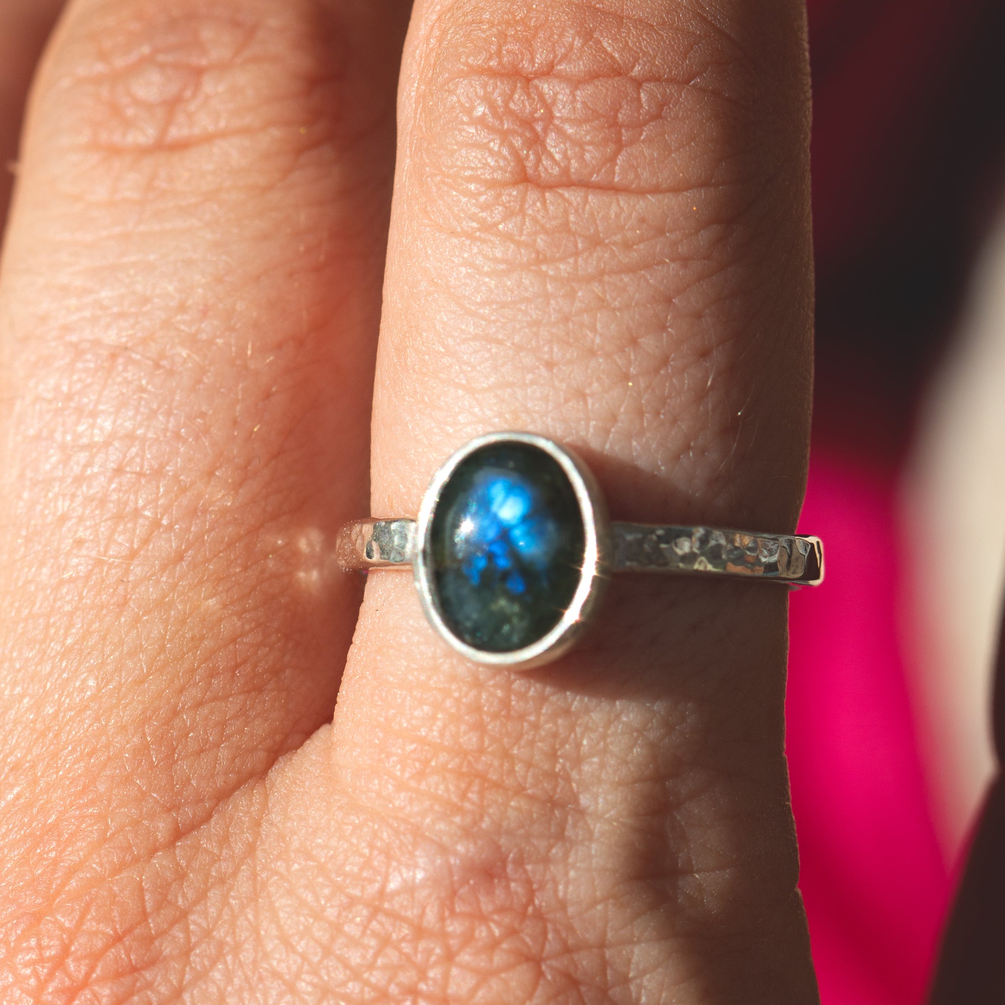 This handcrafted gemstone ring is formed out of sterling silver through the process of hammering, where each strike strengthens and brightens the metal, bringing out its character and beauty. In the same way, the seasons we walk through shape us, strengthening us, and refines us.