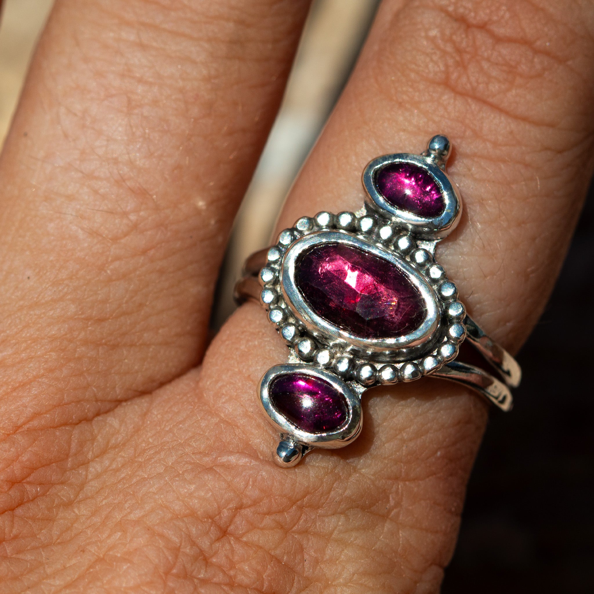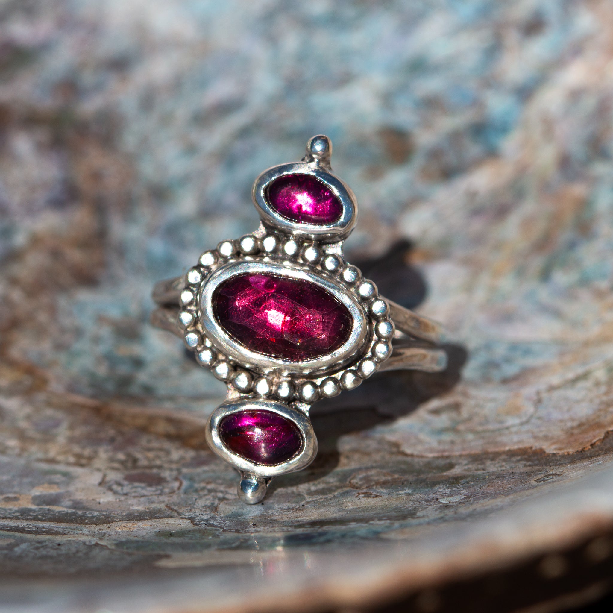 This one-of-a-kind garnet ring features three pink stones set on a double band—designed to make a statement while carrying a deeper reminder close to you.